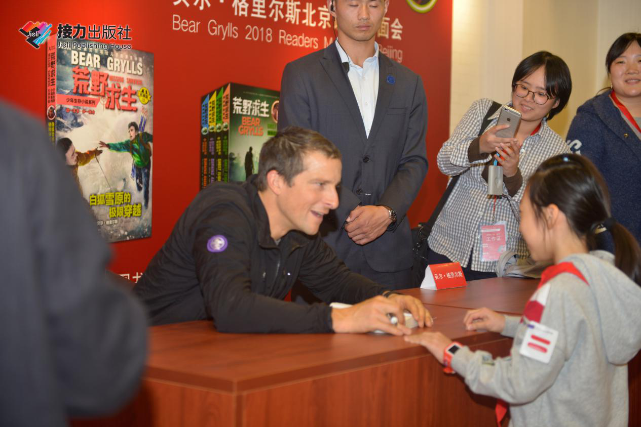 在签售会现场,每一位读者都耐心地等待着贝尔签名,贝尔还亲切地与小读者互动:你叫什么名字?多大了?喜不喜欢“荒野求生”系列图书?……一位70多岁的老奶奶也赶来现场,她不仅是贝尔的忠实书迷,她还带着孙子一起读“荒野求生”系列图书。